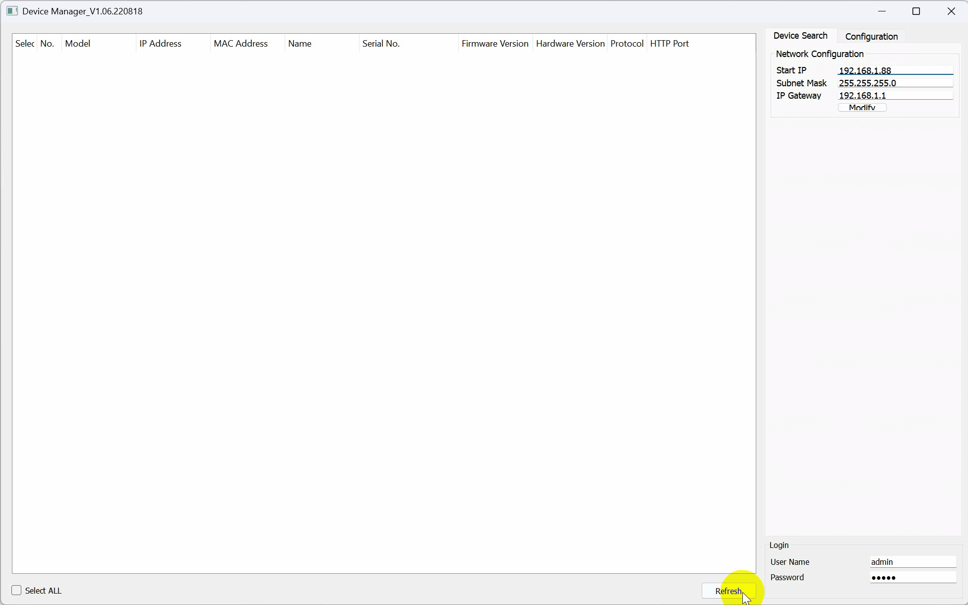 Upgrade Firmware via Device Manager Open the file folder of EncDevice Double click "EncDeviceTool.exe" and then it will work Click "Refresh" -->Enter username and password at the right bottom side; Select the device-->Enter Start IP & IP ...